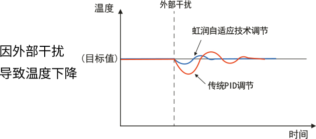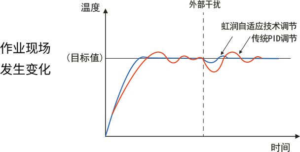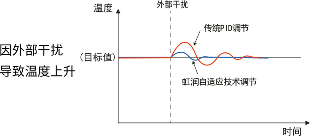 虹潤(rùn)自適應(yīng)技術(shù)自動(dòng)抑制常規(guī)干擾引起的溫度波動(dòng),針對(duì)開(kāi)關(guān)艙室門(mén)時(shí)外部空氣的流入等可預(yù)測(cè)的溫度波動(dòng),穩(wěn)定地進(jìn)行自動(dòng)控制。提高品質(zhì),縮短溫度變化穩(wěn)定所需的時(shí)間,且將溫度波動(dòng)控制在較小限度,為提高生產(chǎn)能力做出貢獻(xiàn)。