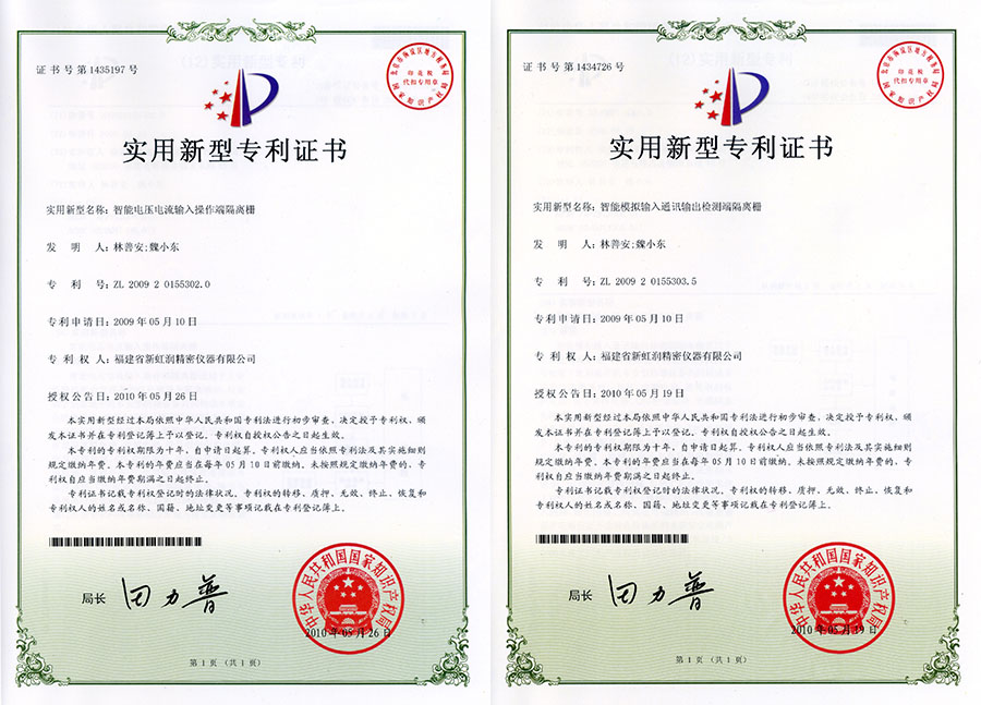 虹潤智能安全柵是虹潤公司全新一代本安系統(tǒng)防爆儀表。產(chǎn)品榮獲智能模擬輸入通訊輸出檢測端隔離柵(專利號 2009201553035)、智能電壓電流輸入操作端隔離柵(專利號2009201553020)2項(xiàng)實(shí)用新型專利,智能隔離式安全柵軟件(版權(quán)登記號2008SR21216)1項(xiàng)軟件著作權(quán),獲得國際SIL2功能安全認(rèn)證證書和國家防爆電氣產(chǎn)品質(zhì)量監(jiān)督檢驗(yàn)中心頒發(fā)的防爆電氣設(shè)備防爆合格證。