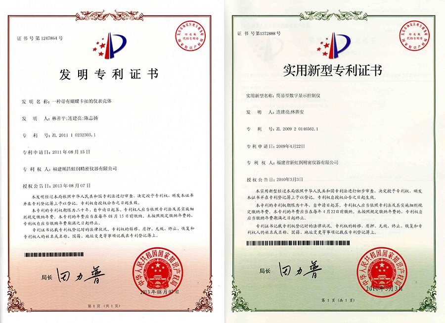 數(shù)顯儀表是虹潤公司全新一代智能數(shù)字精密測量儀表,產(chǎn)品榮獲1項國家發(fā)明專利(專利號 2011102323051),簡易型數(shù)字顯示控制儀 (專利號2009201465621)1項實用新型專利,NHR簡易單路數(shù)字顯示控制儀表軟件(版權(quán)登記號2009SR033683)、NHR單回路數(shù)字顯示控制儀表軟件 (版權(quán)登記號2009SR038317)2項軟件著作權(quán)。