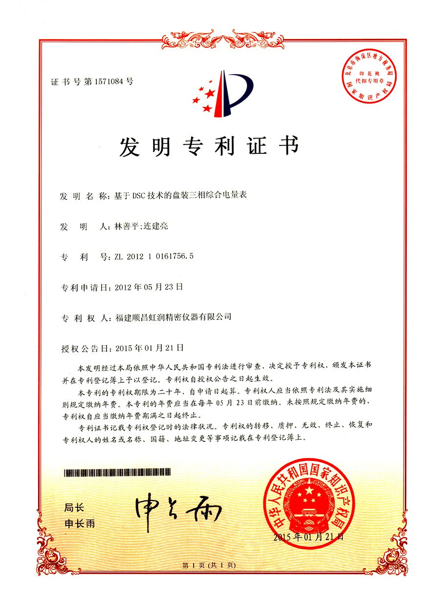 虹潤綜合電量顯示儀表是是一種用于交流電量綜合參數(shù)測量智能儀表。產(chǎn)品應(yīng)用公司自主知識產(chǎn)權(quán)開發(fā),榮獲基于DSC技術(shù)的盤裝三相綜合電量表(專利號2012101617565)國家發(fā)明專利,3300三相綜合電量儀表軟件V1.00(版權(quán)登記號2014SR000776)、NHR液晶綜合電量集中顯示儀軟件V1.00(版權(quán)登記號2014SR139231)、NHR單相電量儀表軟件V1.00(版權(quán)登記號2014SR165558)3項軟件著作權(quán)。
