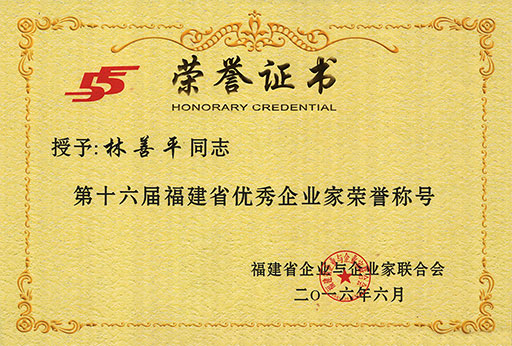 為弘揚優(yōu)秀企業(yè)家深化改革、科學管理、與時俱進、勇于創(chuàng)新的開拓精神,激勵廣大企業(yè)家敢為天下先、愛拼才會贏的闖勁,為推動福建省產(chǎn)業(yè)轉(zhuǎn)型升級和經(jīng)濟持續(xù)健康發(fā)展建功立業(yè),近日,福建省企業(yè)與企業(yè)家聯(lián)合會組織開展了每兩年評選一次的福建省優(yōu)秀企業(yè)家評選工作,并于2016年6月24日決定授予98位企業(yè)經(jīng)營管理者“第十六屆福建省優(yōu)秀企業(yè)家”榮譽稱號,虹潤公司董事長林善平榮獲該榮譽稱號。