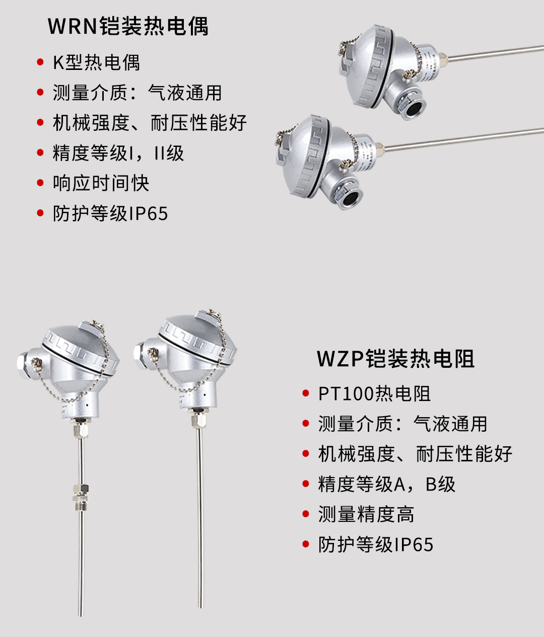 鎧裝式熱電阻熱電偶作為溫度測量傳感器,通常與溫度變送器、調(diào)節(jié)器及顯示儀表等配套使用,組成過程控制系統(tǒng),用以直接測量或控制各種生產(chǎn)過程中流體、蒸汽和氣體介質(zhì)以及固體表面等溫度。