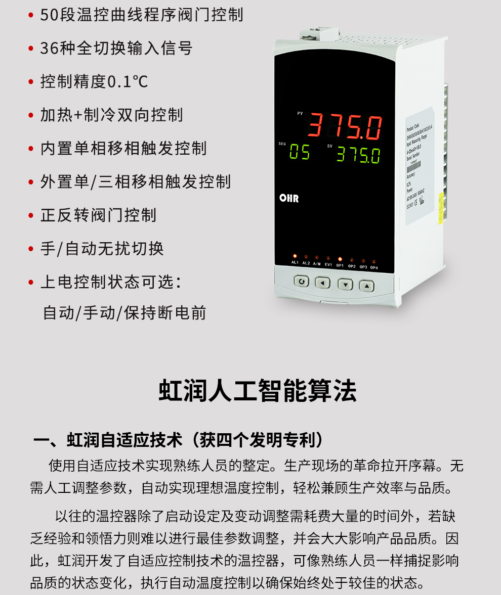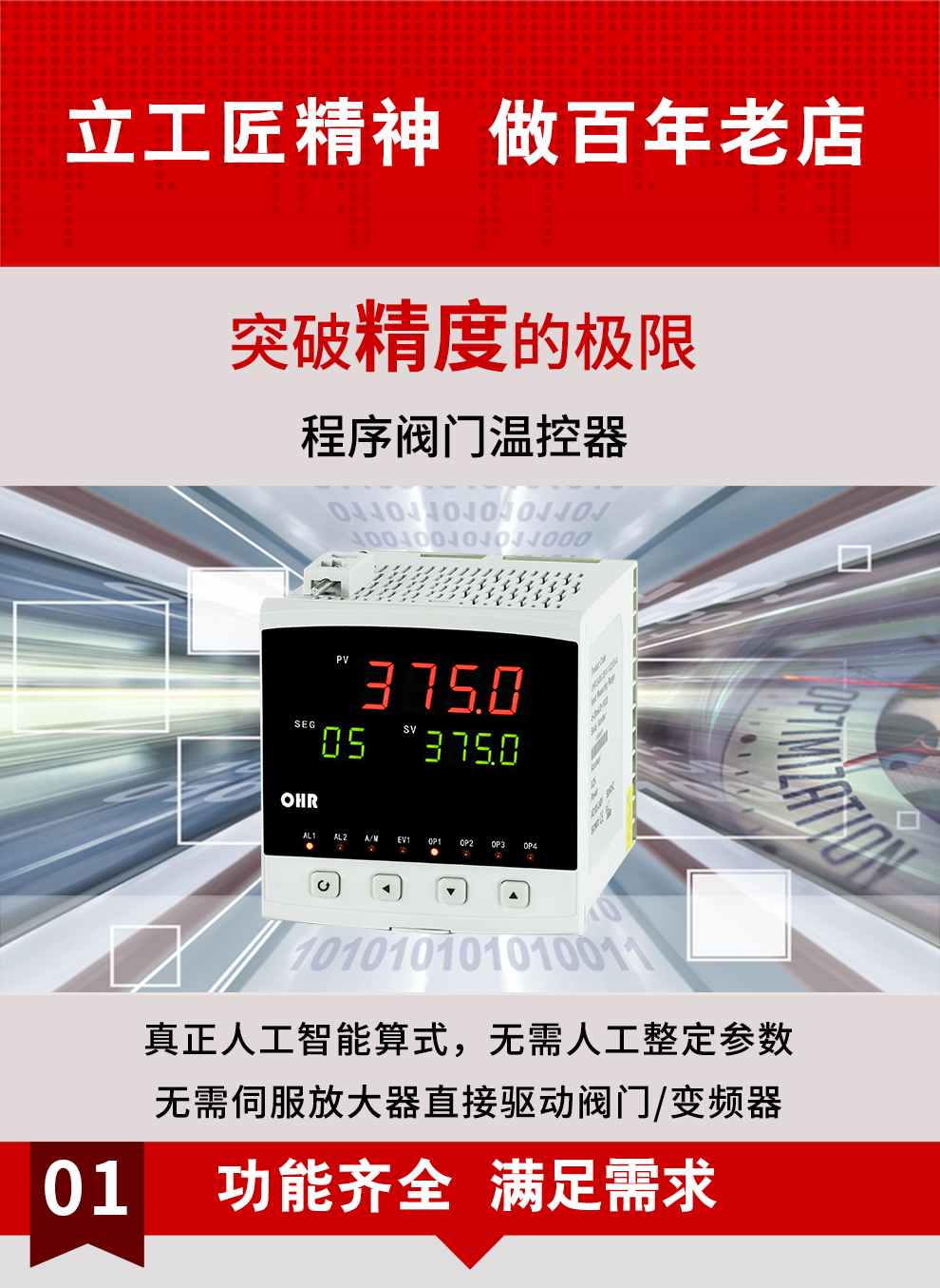 OHR-E401系列程序閥門溫控器/調(diào)節(jié)儀采用真正的人工智能算式,儀表啟動自整定功能,可以根據(jù)被控對象的特性,自動尋找最優(yōu)參數(shù)以達(dá)到很好的控制效果,無需人工整定參數(shù)??販鼐然具_(dá)±0.1℃,無超調(diào)、欠調(diào),達(dá)國際先進(jìn)水平。
