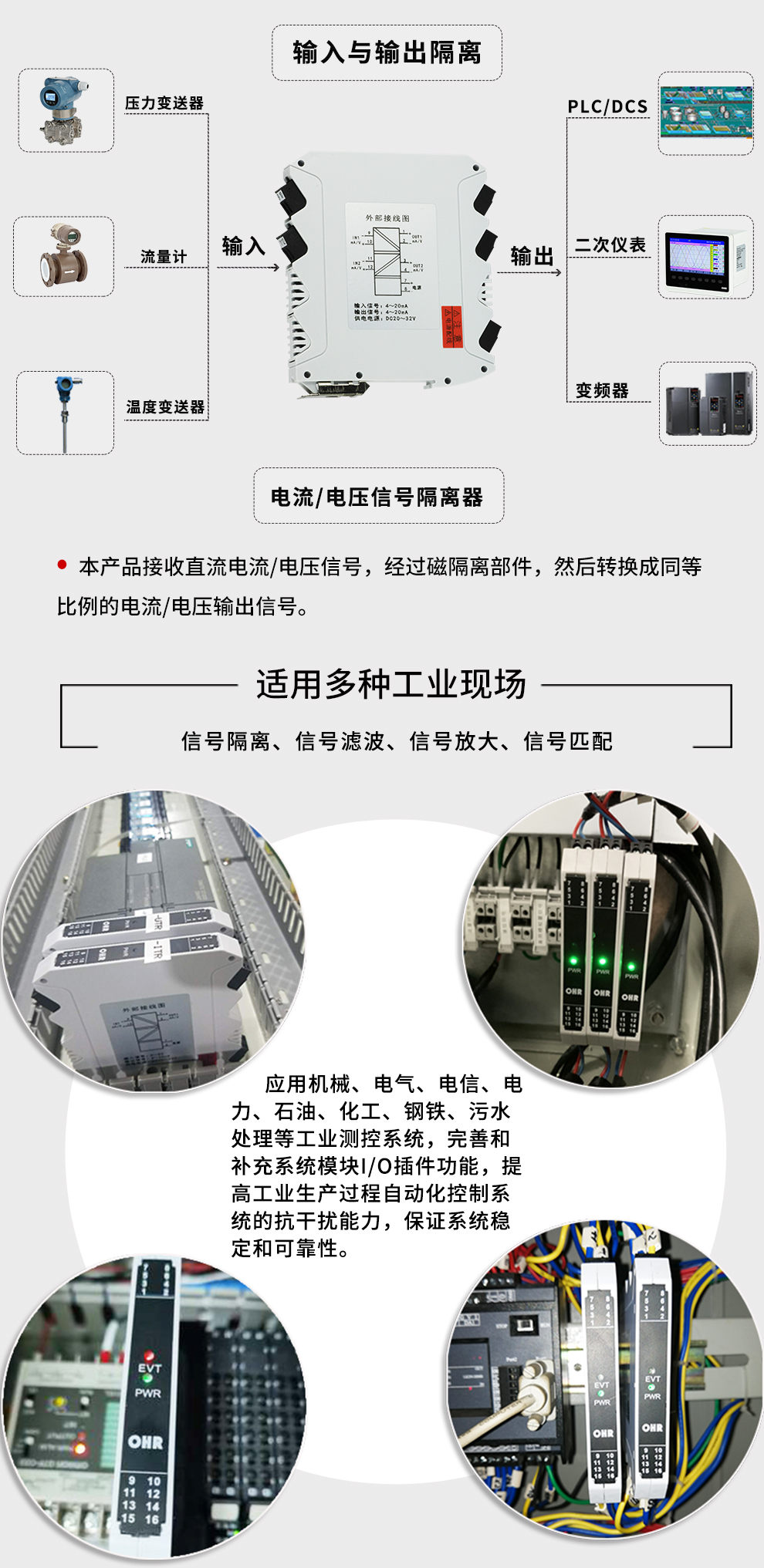 OHR-M21系列電壓/電流隔離器將直流電壓或電流信號經(jīng)過隔離傳送,轉(zhuǎn)換成所需的信號給其它儀表??梢耘c單元組合儀表及DCS、PLC等系統(tǒng)配套使用,給予現(xiàn)場儀表信號隔離、信號轉(zhuǎn)換、信號分配、信號處理等,從而提高工業(yè)生產(chǎn)過程自動控制系統(tǒng)的抗干擾能力,保證系統(tǒng)的穩(wěn)定性和可靠性。