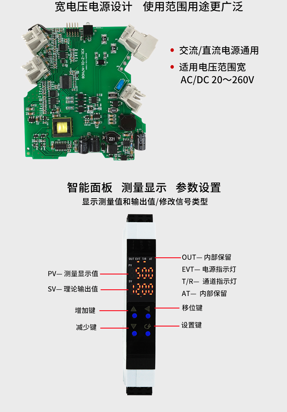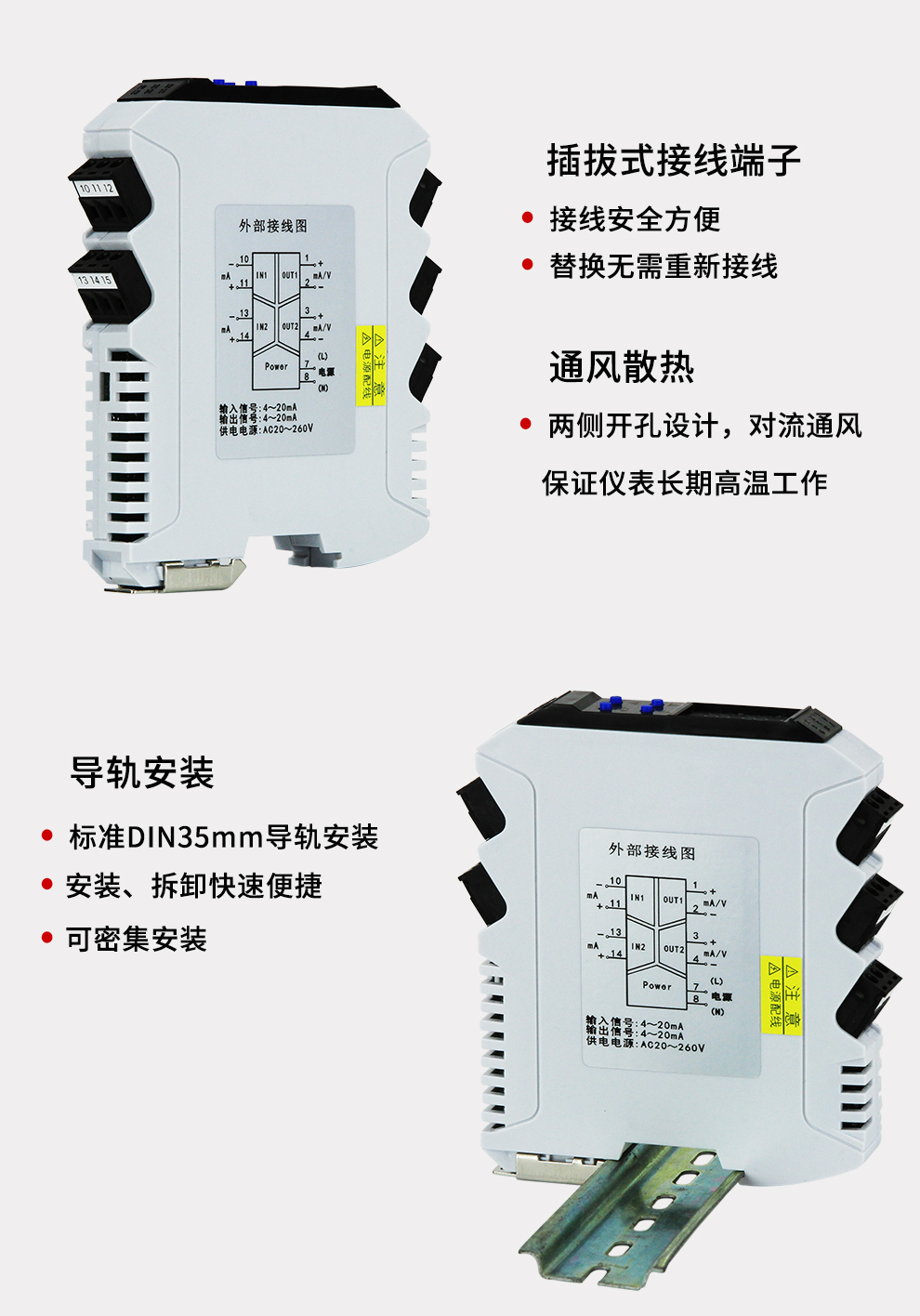 OHR-X31系列導(dǎo)軌式智能隔離器將現(xiàn)場的直流電壓或電流信號(hào)經(jīng)過隔離傳送,轉(zhuǎn)換成所需的信號(hào)給其它儀表??梢耘cDCS、PLC等系統(tǒng)配套使用,從而提高工業(yè)生產(chǎn)過程自動(dòng)控制系統(tǒng)的抗干擾能力,保證系統(tǒng)的穩(wěn)定性和可靠性。寬電源設(shè)計(jì):20-260V交直流供電。配置高清顯示單元,通過輕觸按鍵設(shè)置每個(gè)通道的參數(shù)及通道之間的切換。