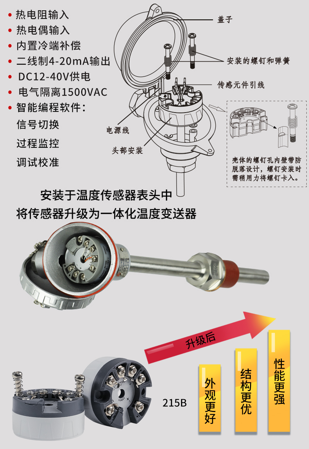 HART智能溫度變送器(圓卡),用于熱電阻(RTD)、熱電偶(TC)信號輸入,二線制4~20mA模擬輸出,通過HART協(xié)議組態(tài),安裝于傳感器內(nèi)部(Form B)。