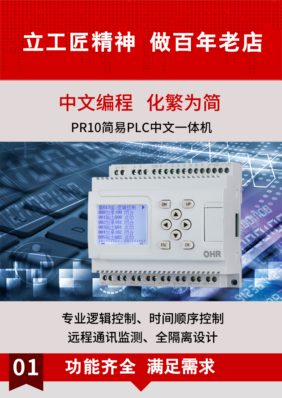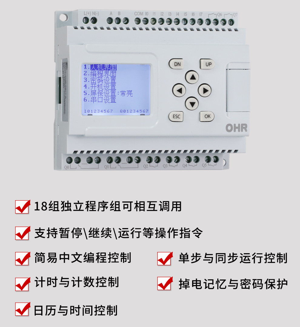 OHR-PR10系列簡(jiǎn)易PLC中文一體機(jī)是一款中文可編程邏輯控制器,集邏輯判斷、輸出、延時(shí)、計(jì)時(shí)、計(jì) 數(shù)、跳轉(zhuǎn)、循環(huán)等功能于一體。適用于公共區(qū)域照明、綠化帶灌溉、養(yǎng)殖投喂控制、設(shè)備邏輯控制與時(shí)序控制。