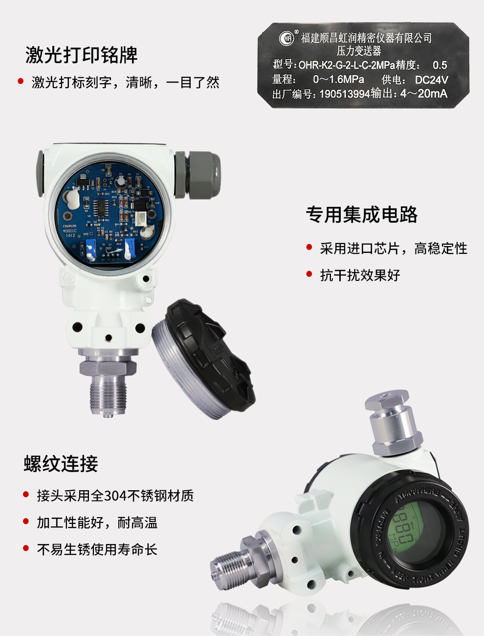 K系列壓力變送器采用具有國際先進水平的擴散硅傳感器,配合高精度電子元件,經(jīng)嚴格的工藝過程裝配而成。充分發(fā)揮了傳感器的技術(shù)優(yōu)勢,使該系列壓力變送器具有優(yōu)異的技術(shù)性能。該變送器抗過載和抗沖擊能力強、溫度漂移小、穩(wěn)定性高,具有很高的測量精度。