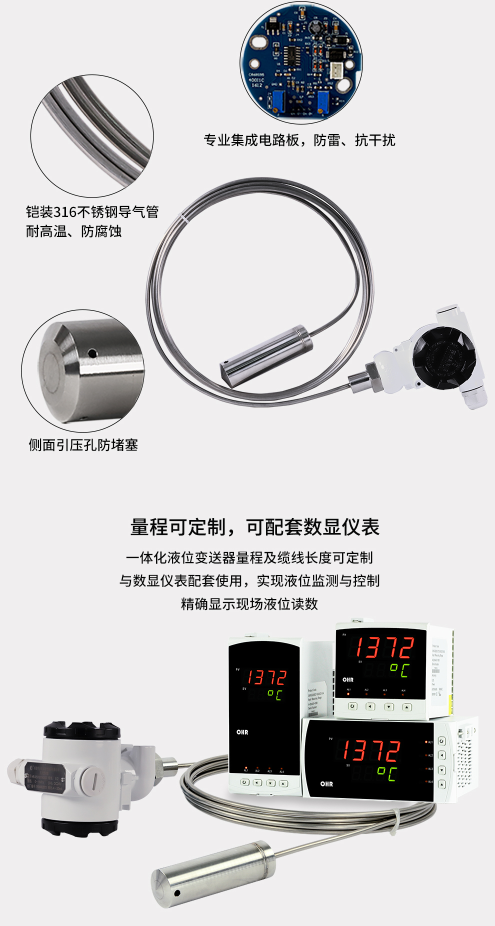 OHR-L2系列鎧裝投入式液位變送器使用進(jìn)口高精度、高穩(wěn)定性擴(kuò)散硅壓力敏感芯片,通過高可靠性的放大電路,將被測(cè)液體的液位信號(hào)轉(zhuǎn)換成4~20mA DC標(biāo)準(zhǔn)信號(hào)。