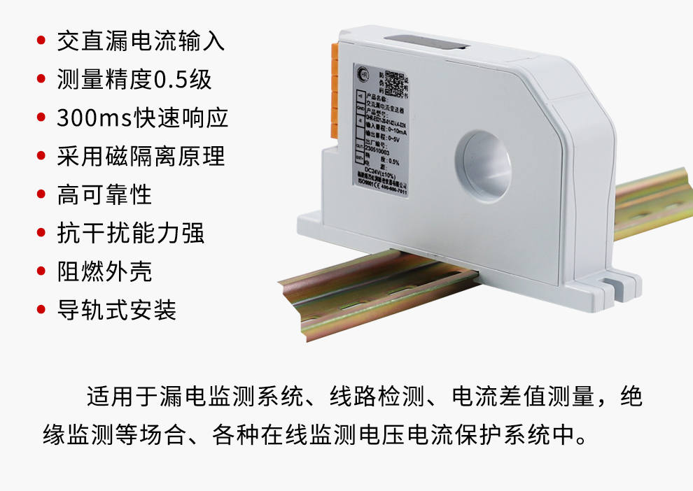 OHR-ES30系列交流/直流漏電流變送器對電網(wǎng)和電路中的交直流電流信號進(jìn)行實(shí)時(shí)測量,具有高精度、高隔離、 低漂移、低功耗、體積小、響應(yīng)快、抗干擾能力強(qiáng)等特點(diǎn)。本產(chǎn)品采用標(biāo)準(zhǔn)DIN35mm導(dǎo)軌安裝,端子接線,安裝方 便,適用于測量漏電監(jiān)測系統(tǒng),線路檢測,電流差值測量,絕緣監(jiān)測等場合。