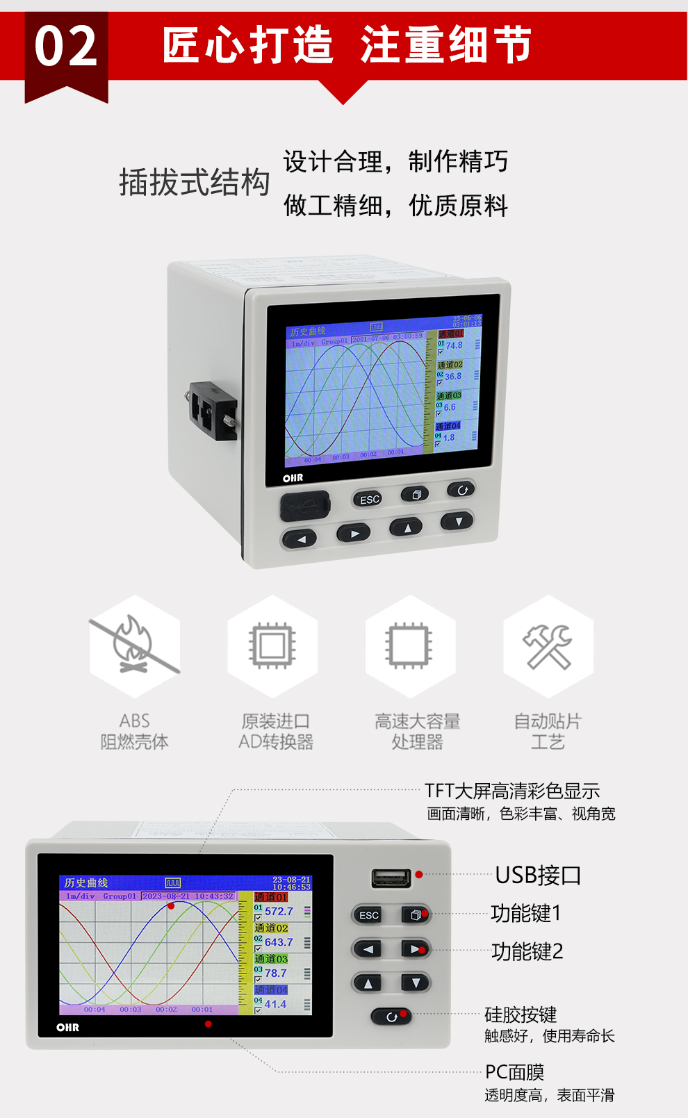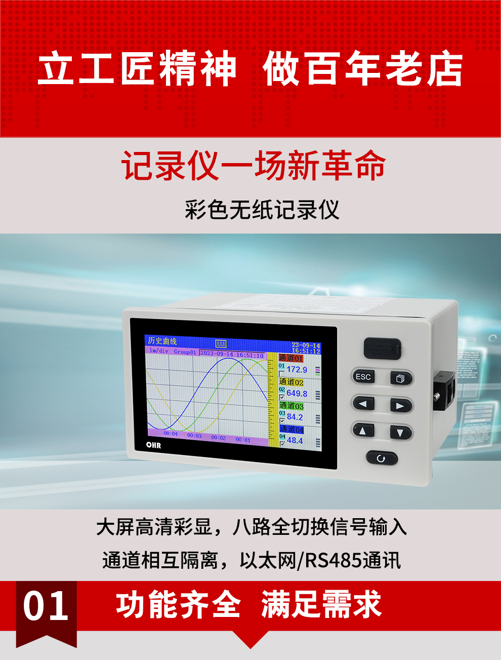 OHR-G100T系列彩色無紙記錄儀是一款體積小巧、功能強大的無紙記錄儀。采用大屏高清真彩液晶屏為顯示 窗口,使產(chǎn)品具有顯示清晰、色彩豐富等特點。內(nèi)核采用高速、高性能32位ARM微處理器,操作簡便、響應(yīng)快 ,記錄存儲與控制功能強大,是一款功能齊全、操作方便、精確可靠、高性價比的產(chǎn)品,在各行各業(yè)中得到廣泛 應(yīng)用。