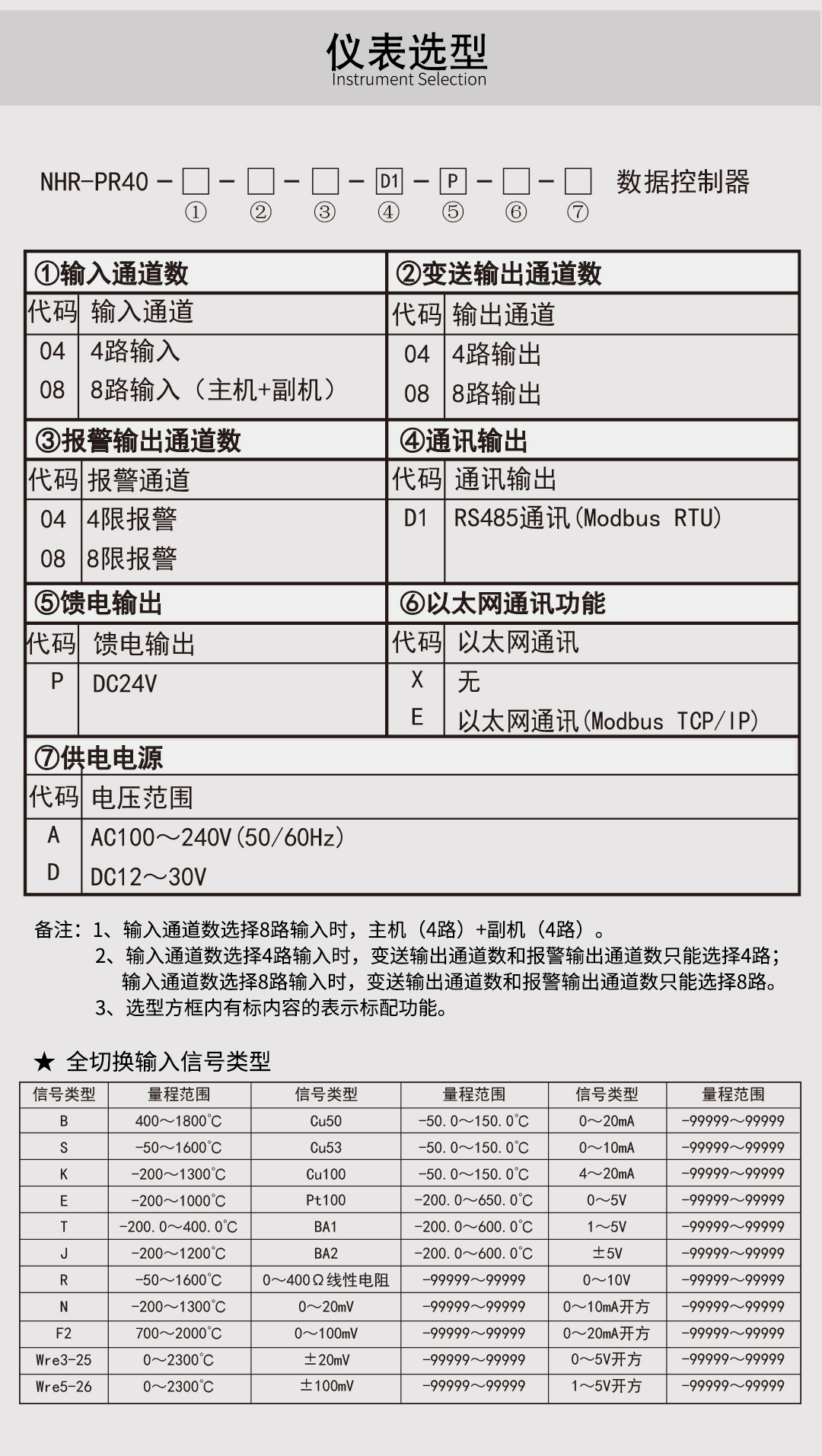 NHR-PR40系列數(shù)據(jù)控制器多重保護和隔離設 計,抗干擾能力強,可靠性高。儀表采用主副機結(jié)構(gòu)設計,主機可提供4路萬能信號輸入,通道間 相互隔離;4限報警輸出、4路變送輸出,饋電輸出、RS485通訊、以太網(wǎng)通訊等功能,連接副機可將I/O容量 擴展至8路輸入和8限報警輸出、8路變送輸出。