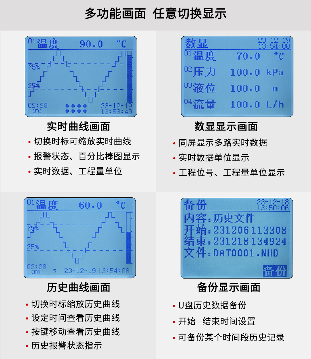 NHR-PR50系列數(shù)據(jù)記錄器顯示功能強(qiáng)大,具有實(shí)時(shí)曲線畫、數(shù)顯畫面、歷史追憶畫面、備份畫面。儀表采用主副機(jī)結(jié)構(gòu)設(shè)計(jì),主機(jī)可提供4路萬(wàn)能信號(hào)輸入,通道間 相互隔離;4限報(bào)警輸出、4路變送輸出,RS485通訊、以太網(wǎng)通訊等功能,連接副機(jī)可將I/O容量 擴(kuò)展至8路。帶USB數(shù)據(jù)轉(zhuǎn)存功能,存儲(chǔ)時(shí)間最長(zhǎng)可達(dá)5825天。