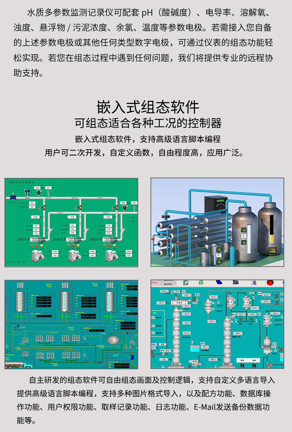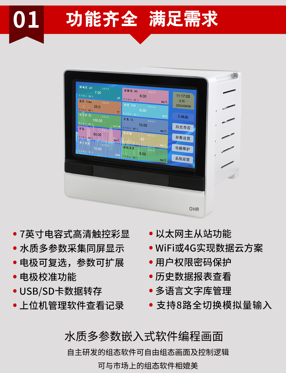 OHR-SZ80系列水質(zhì)多參數(shù)監(jiān)測(cè)記錄儀是一款多參數(shù)可組合的水質(zhì)監(jiān)測(cè)控制器,可通過(guò)RS485通訊采集現(xiàn)場(chǎng)pH(酸堿度)、電導(dǎo)率、溶解氧、濁度、污泥、余氯、溫度等水質(zhì)參數(shù),產(chǎn)品可實(shí)現(xiàn)水質(zhì)電極的數(shù)據(jù)采集、記錄分析、變送、報(bào)警控制、以太網(wǎng)通訊、WiFi或4G實(shí)現(xiàn)數(shù)據(jù)云方案。