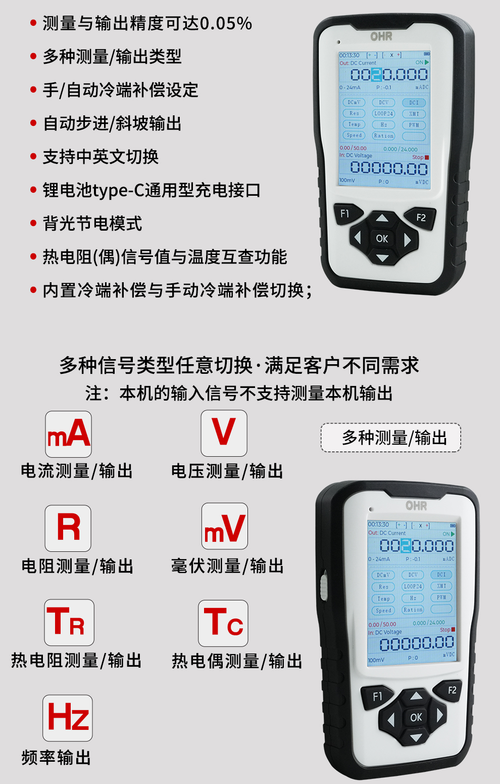 OHR-D00經濟型過程校驗儀是帶測量與輸出的過程信號校驗儀。產品具 有高精度、信號任意切換、續(xù)航能力強、大彩屏占比、小巧便攜等特點, 產品功能設置簡單易用,為使用者帶來了更便捷的體驗。