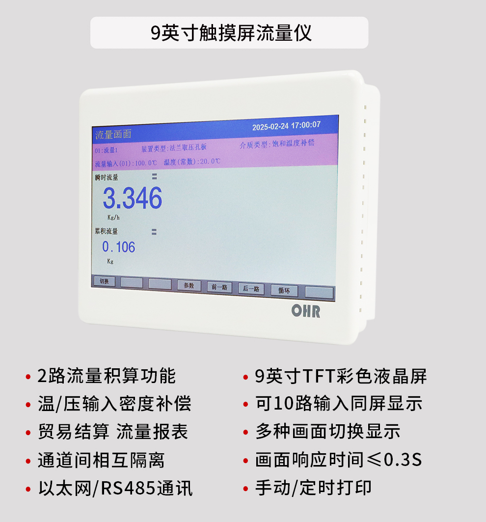 NHR系列系列觸摸屏流量儀最多6路萬能輸入其中可帶2路流量輸入。具有繼電器報(bào)警輸出、變送 輸出,饋電輸出,流量積算,溫壓補(bǔ)償功能;可帶RS485通訊接口,以太網(wǎng)接口,微型打印機(jī)接口;具有強(qiáng)大的顯示功能,實(shí)時測量顯示,棒圖顯示,報(bào)警狀態(tài)顯示,流量顯