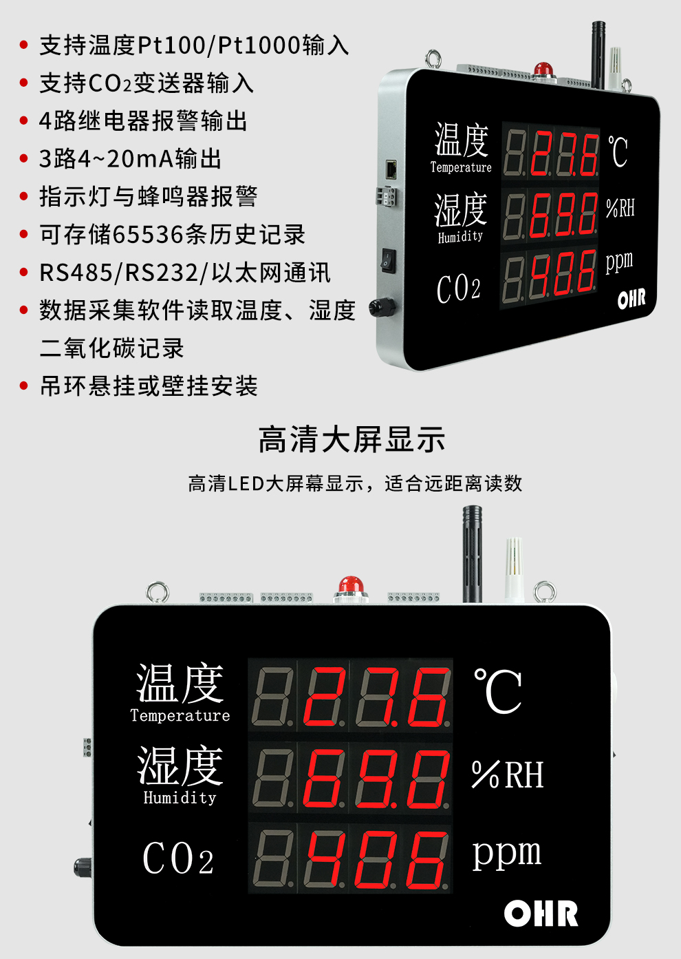 OHR-WS54系列大屏二氧化碳溫濕度記錄儀采用高精度的采集電路及進(jìn)口傳感器,對(duì)環(huán)境的二氧化碳、溫濕 度等進(jìn)行實(shí)時(shí)監(jiān)測(cè)、報(bào)警與記錄。本產(chǎn)品采用鋁合金邊框,高品質(zhì)亞克力面板,外觀美觀大方;大屏幕 LED數(shù)碼管顯示,醒目、便捷,實(shí)時(shí)顯示二氧化碳值和溫濕度值等信息;可選配RS485、RS232通訊接口或以 太網(wǎng)通訊接口,通過(guò)配套的上位機(jī)軟件讀取歷史記錄。該產(chǎn)品適用于多種場(chǎng)合,尤其適用于倉(cāng)庫(kù)、車(chē)間、 畜牧業(yè)中室內(nèi)環(huán)境溫濕度的監(jiān)測(cè)。