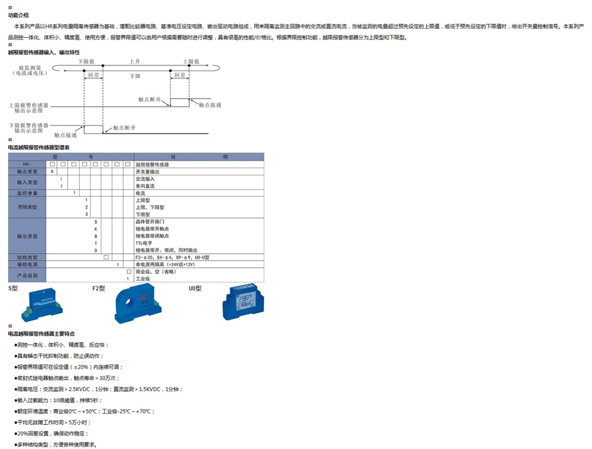 電流越限報警傳感器以HR系列電量隔離傳感器為基礎,增配比較器電路、基準電壓設定電路、輸出驅(qū)動電路組成,用來隔離監(jiān)測主回路中的交流或直流電流,當被監(jiān)測的電量超過預先設定的上限值,或低于預先設定的下限值時,給出開關量控制信號。